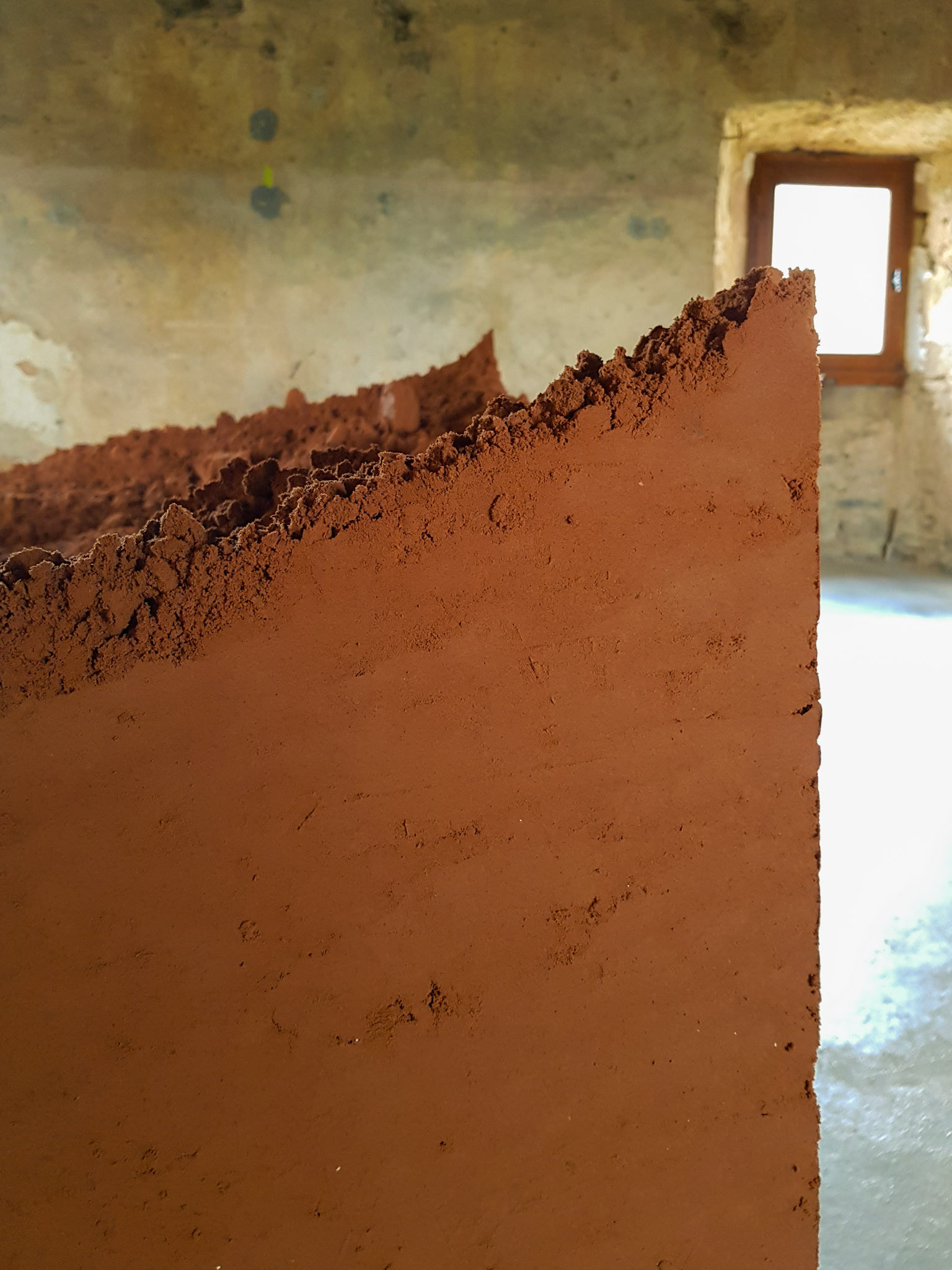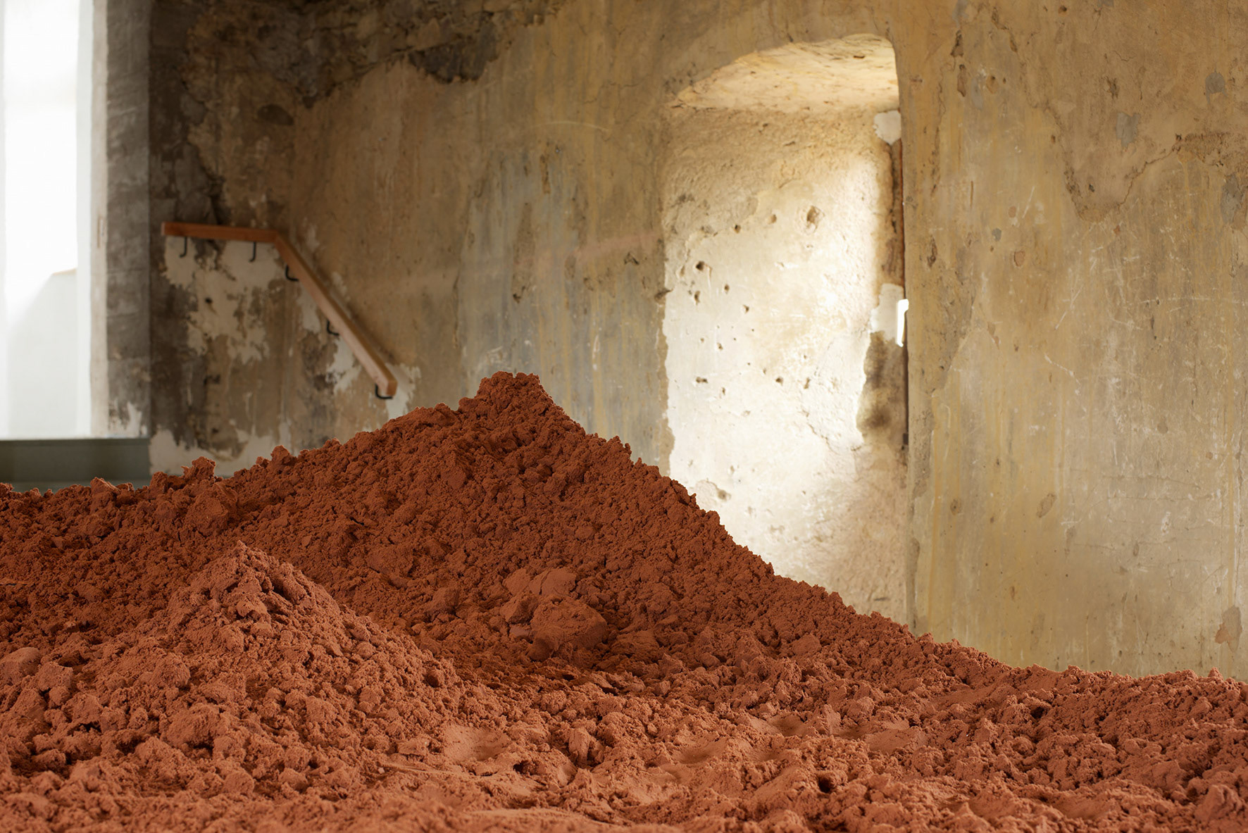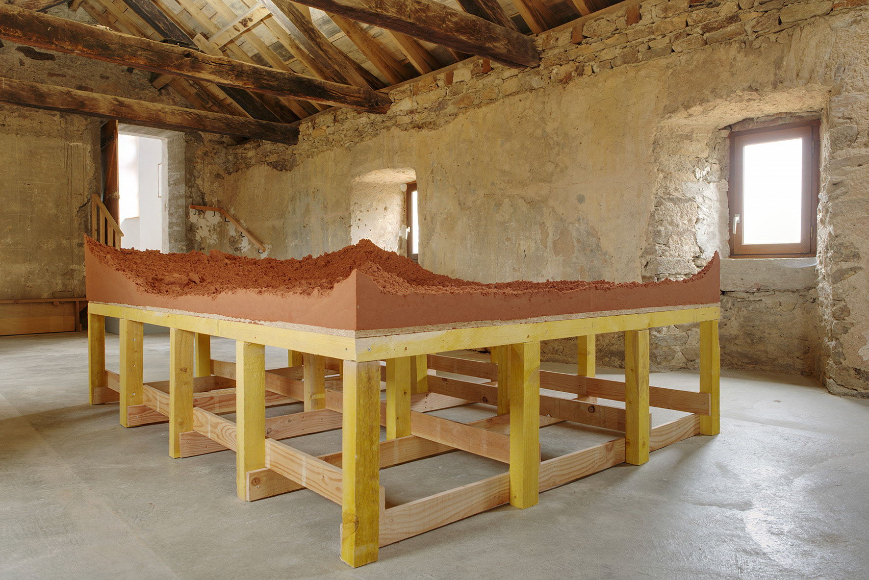 Selon une légende locale, le château aurait été construit avec des pierres trouvées à un endroit indiqué par le grattement régulier des taureaux sur le sol. Ex nihilo – La Piste nous montre un terrain couvert d’empreintes bovines qui convergent vers ce qui serait le lieu d’enfouissement originel, le creuset ex nihilo des bâtisses du village. Sur socle, ce territoire morcelé, à mi-chemin entre le bac à sable et le diorama, nous donne à voir le plancher des vaches dont le matériau sable de fonderie vient jouer la terre aride, stérile, aux couleurs martiennes, celle qui ne génère que le minéral.