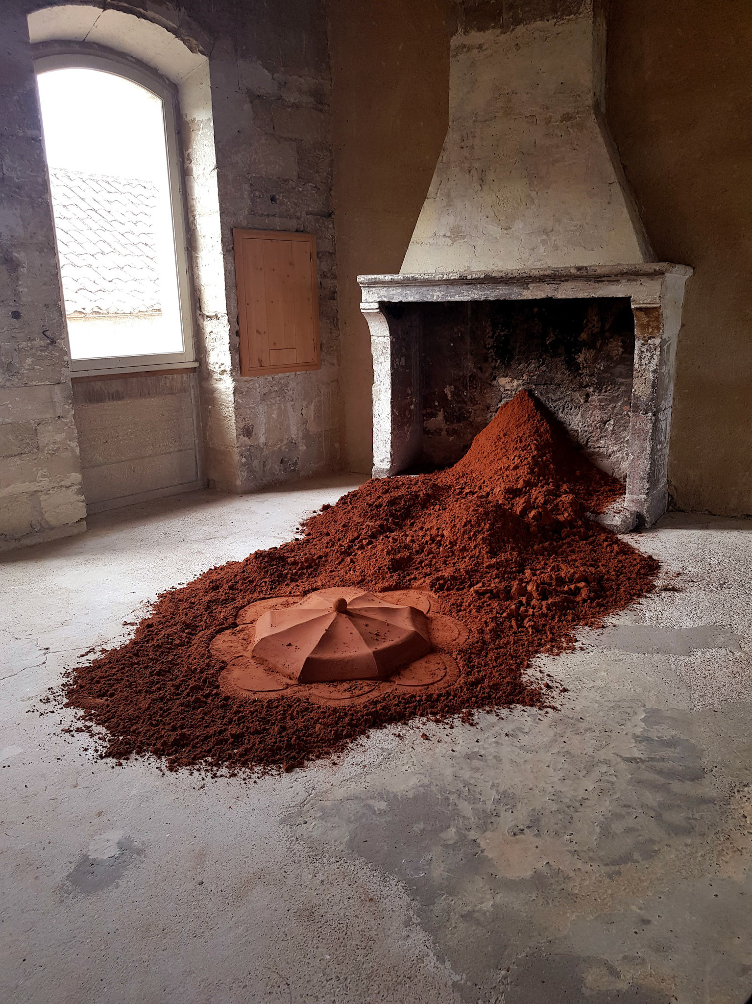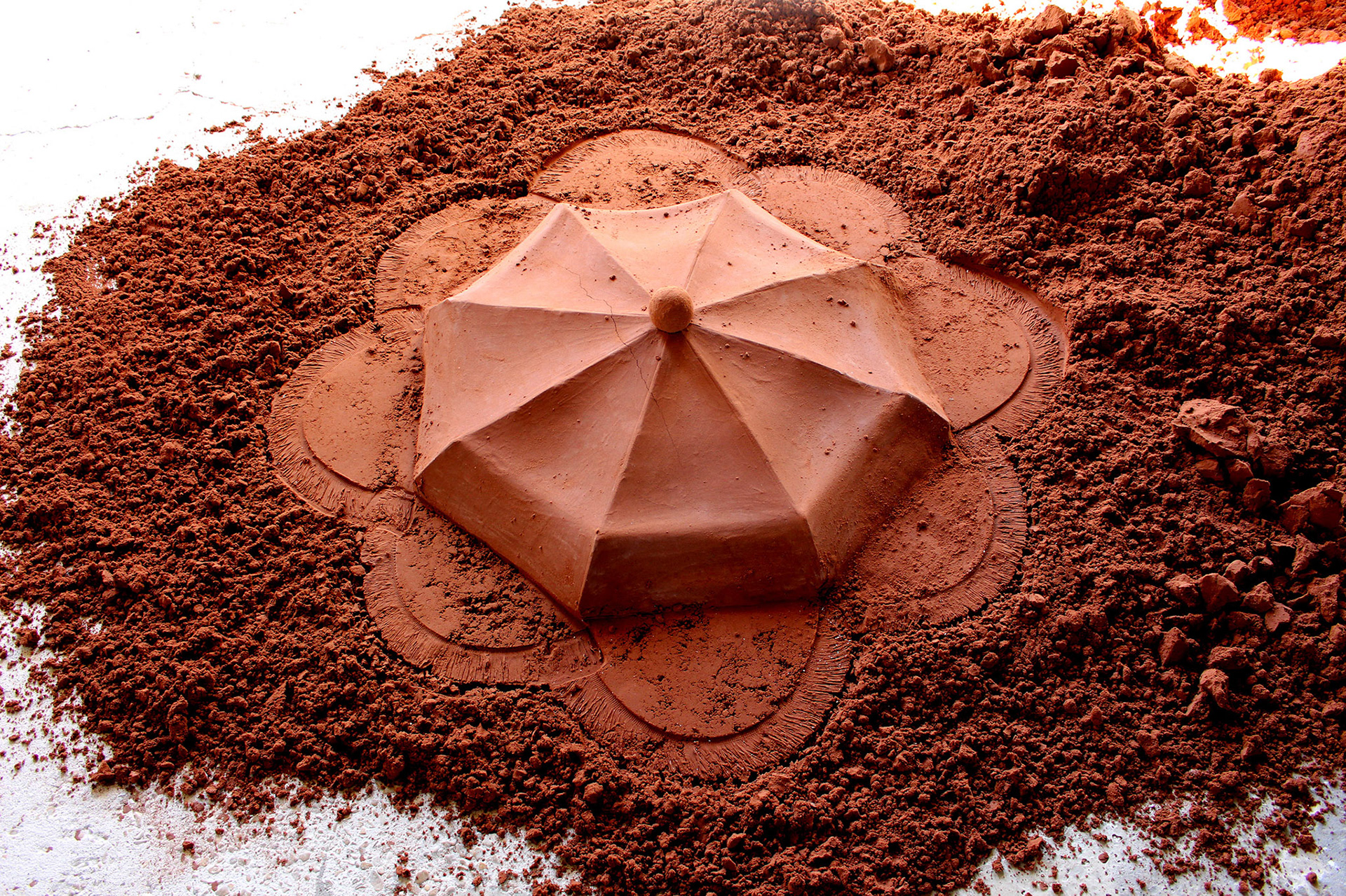 L'univers cartésien construit le monastère comme un substitut de désert, un désert artificiel. Partant de cette image - qui n'est pas sans nous rappeler les paradis artificiels, jalonnés au même titre de contemplations hallucinatoires - Ombrellino reprend la forme de l'objet liturgique du même nom et nous en propose le dôme, émergeant tel un pâté de sable dans un désert miniature. Le matériau employé joue d'une esthétique de l'effritement qui induit un rapport au temps, celui d'un jeu passé, et nous amène à considérer cet ombrellino tout proche d'un mirage où se fondent parasol enseveli et coupole miniature.